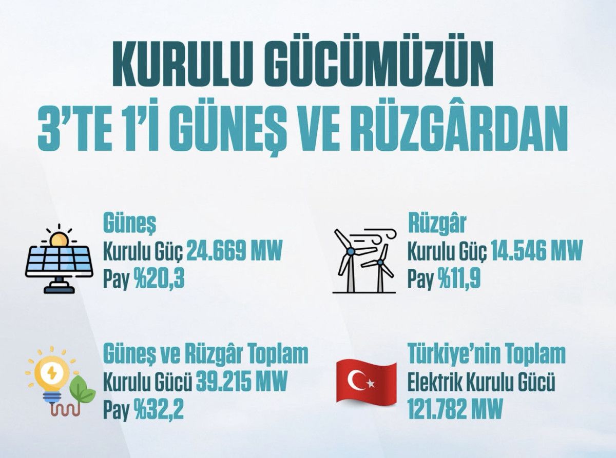 Bayraktar, Türkiye’nin elektrik kurulu gücünde güneşin payının yüzde 20,3’e, rüzgarın payının yüzde 11,9’a yükseldiğini belirterek, “Böylece, kurulu gücümüzün 3’te 1’i sadece rüzgar ve güneşten oluştu.” bilgisini paylaştı.