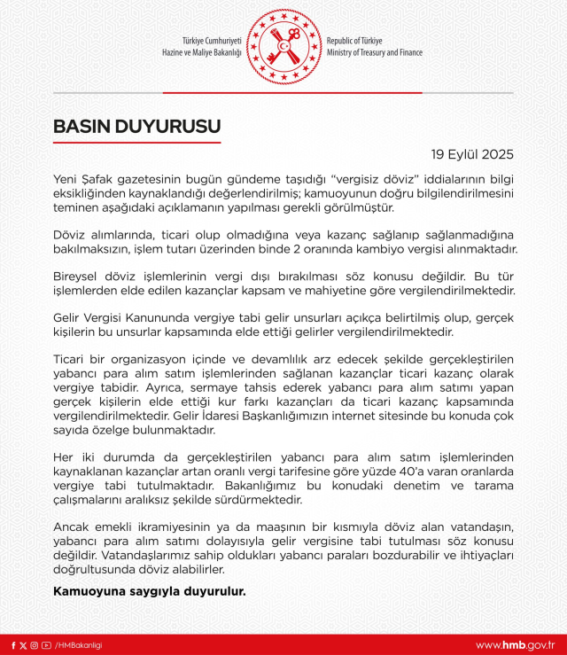 Hazine ve Maliye Bakanlığı bazı basın yayın organlarında da yer alan iddiaya ilişkin yazılı açıklama yaptı. Çıkan haberleri yalanlayan bakanlığın açıklamasında şu ifadeler yer aldı; “Bugün bir basın yayın organı tarafından gündeme taşınan ‘vergisiz döviz’ iddialarının bilgi eksikliğinden kaynaklandığı değerlendirilmiş; kamuoyunun doğru bilgilendirilmesini teminen aşağıdaki açıklamanın yapılması gerekli görülmüştür.