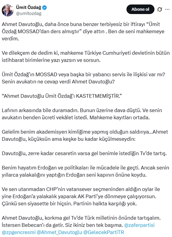 Davutoğlu’nun Haberler.com yayınındaki sözlerine Zafer Partisi Genel Başkanı Ümit Özdağ, X hesabından yanıt verdi. Özdağ paylaşımında şu ifadeleri kullandı “Ahmet Davutoğlu, daha önce buna benzer terbiyesiz bir iftirayı ‘Ümit Özdağ MOSSAD’dan ders almıştır’ diye attın . Ben de seni mahkemeye verdim. Ve dilekçem de dedim ki, mahkeme Türkiye Cumhuriyeti devletinin bütün istihbarat birimlerine yazı yazsın ve sorsun. Ümit Özdağ’ın MOSSAD veya başka bir yabancı servis ile ilişkisi var mı? Senin avukatın ne cevap verdi Ahmet Davutoğlu?